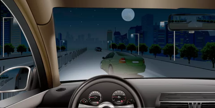 23. 如图所示,夜间驾驶机动车遇到其他机动车突然驶入本车道,可加速从右侧车道绕行。