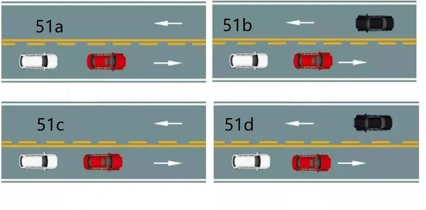 如图所示,以下哪种情况可以超车?(图51a.51b. 51c. 51d)