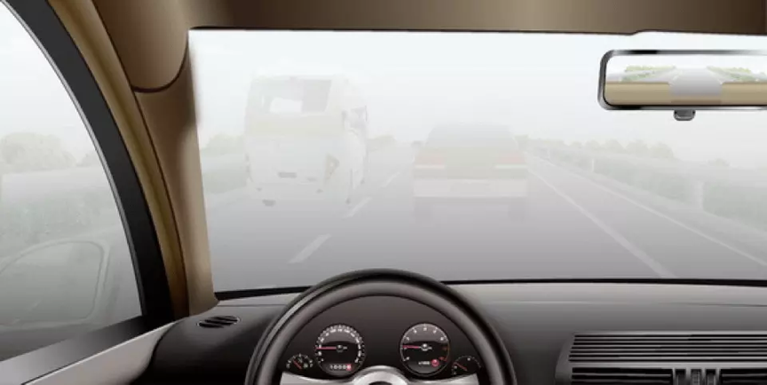 如图所示,雾天驾驶机动车跟车行驶,应加大与前车的距离。